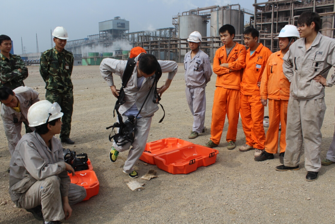 上午10:00時(shí),安全環(huán)保處技術(shù)員何開(kāi)順、陳紅到溶出現場(chǎng)空地對各車(chē)間員工進(jìn)行消防器和空氣呼吸器的使用方法的培訓指導,說(shuō)明比賽流程和比賽規則后組織按照原料、溶出、分解、蒸發(fā)、焙燒、煤氣、熱電、電控、裝備、化驗、行政出場(chǎng)順序開(kāi)始進(jìn)行比賽。各參賽隊員均勢若猛虎、爭分奪秒,最終化驗車(chē)間李翔以15'44"的成績(jì)拿下消防水帶使用比賽第一名,熱電車(chē)間蔣勝以15'72"取得消防水帶使用比賽第二名,行政處陳方以16'61"取得消防水帶使用比賽第三名;焙燒車(chē)間羅奉彬以14'80"取得空呼器呼吸器比賽第一名,煤氣車(chē)間熊津凱以16'88"取得第二名,熱電車(chē)間聶明福18'72"取得第三名。