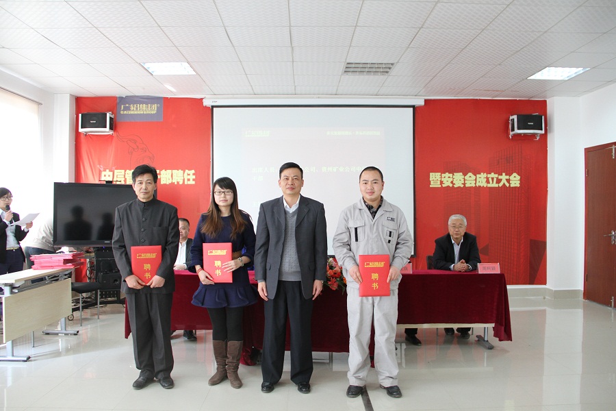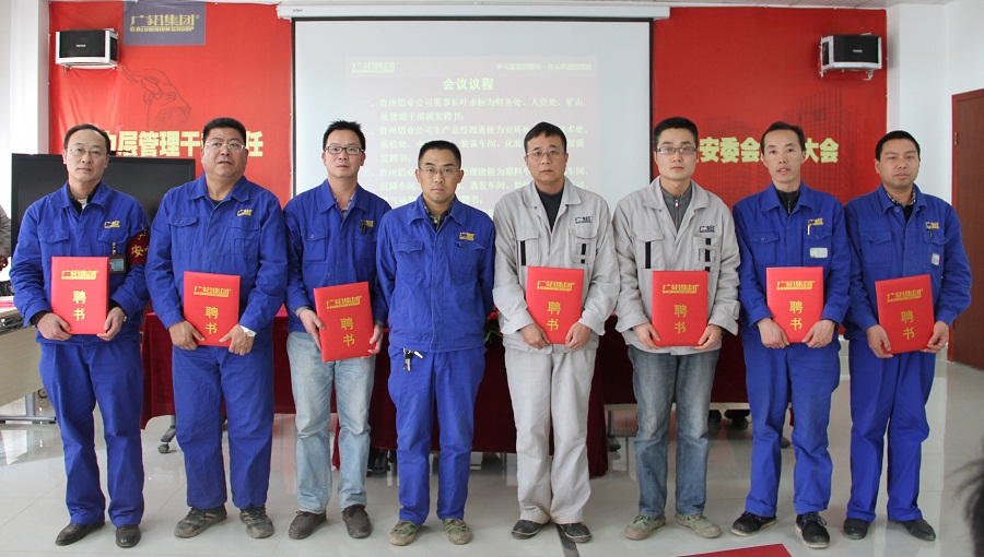 2015年1月13日,貴州鋁業(yè)公司和貴州礦業(yè)公司2015年中層管理干部聘任大會(huì )暨安全環(huán)保責任人任命大會(huì )在貴州鋁業(yè)公司綜合辦公樓五樓會(huì )議室隆重舉行。公司董事長(cháng)葉永標、礦業(yè)公司總經(jīng)理張戰旗以及生產(chǎn)總經(jīng)理唐俊分別為2015年度中層管理干部頒發(fā)了聘書(shū)。