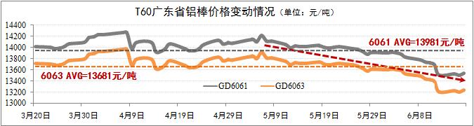 鋁棒現貨價(jià)格明顯下浮。截至6月17日,廣東6061棒價(jià)格下浮至13545元/噸,6063棒價(jià)格下浮至13245元/噸,兩者均低于60天(T60)均價(jià)超過(guò)400元/噸。鋁棒價(jià)格迅速下浮主要受原鋁市場(chǎng)價(jià)格下浮的影響。隨著(zhù)鋁材生產(chǎn)旺季的到來(lái)以及鋁材出口的增長(cháng),預計鋁棒下浮趨勢于7月初出現溫和反彈,省內6061棒及6063棒的價(jià)格回歸至T60均價(jià)水平的可能性較大。