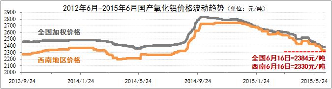 國產(chǎn)價(jià)格走勢偏弱。上半年國產(chǎn)氧化鋁價(jià)格維系了年初下滑的基本趨勢。截至6月16日,全國氧化鋁加權均價(jià)為2384元/噸,西南地區價(jià)格與全國加權均價(jià)的價(jià)差縮小至近50元/噸,同期均價(jià)為2330元/噸。其中,貴州均價(jià)為2340元/噸,略高于西南地區均價(jià)。從市場(chǎng)實(shí)際成交表現上看,雖然目前國產(chǎn)氧化鋁市場(chǎng)逐步恢復至去年平均水平,但在鋁價(jià)不景氣的環(huán)境下,氧化鋁市場(chǎng)價(jià)格難以堅挺。