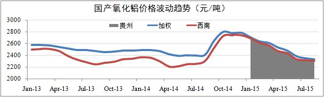 國產(chǎn)價(jià)格繼續下浮。報告期內,國產(chǎn)氧化鋁價(jià)格仍維持繼續下滑的基本趨勢,但整體降幅有所收窄。截至8月19日,國產(chǎn)日均價(jià)為2,325元/噸,月化同比下浮2.2%。其中,西南地區報價(jià)2,285元/噸,月化同比下浮0.9%;貴州報價(jià)2,285元/噸,月化同比下浮1.7%。目前,國產(chǎn)氧化鋁價(jià)格上浮機制尚未形成,預計第三季度氧化鋁價(jià)格將維持在2,250-2,450元/噸的均衡水平。