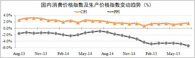 通貨緊縮預期增強。截至7月份,國內價(jià)格總水平運行依然偏弱,以消費價(jià)格指數(CPI)和生產(chǎn)價(jià)格指數(PPI)為主的經(jīng)濟面出現“剪刀差”現象。數據顯示,7月份CPI環(huán)比上漲0.3%,同比上漲1.6%;PPI環(huán)比下降0.7%,同比下降5.4%。其中PPI已連續41個(gè)月出現負增長(cháng),且幅度逐月擴大。CPI與PPI增幅差距的進(jìn)一步擴大強化了國內通貨緊縮預期,宏觀(guān)經(jīng)濟增長(cháng)風(fēng)險加大。
