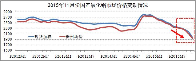 國內價(jià)格方面統計期內,全國氧化鋁市場(chǎng)價(jià)格繼續保持了今年以來(lái)的下行趨勢,且下行幅度有所擴大。其中:11月國產(chǎn)現貨加權1985元/噸,環(huán)比下降8.3%,降幅環(huán)比擴大了4.1個(gè)百分點(diǎn);貴州均價(jià)1947元/噸,環(huán)比下降7.4%,降幅環(huán)比擴大了1.4個(gè)百分點(diǎn)。研究認為,目前氧化鋁市場(chǎng)價(jià)格直線(xiàn)下浮屬于異?,F象,主要原因是電解鋁做空力量加劇了市場(chǎng)悲觀(guān)預期。