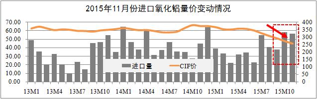 進(jìn)口市場(chǎng)方面:統計期內,進(jìn)口氧化鋁市場(chǎng)價(jià)格波動(dòng)趨勢基與國內市場(chǎng)基本一致。進(jìn)口量方面,10月全國進(jìn)口氧化鋁58萬(wàn)噸,11月進(jìn)口56萬(wàn)噸,較去年同期增長(cháng)27%,環(huán)比有所回落;價(jià)格方面,11月CIF均價(jià)319美元,折合人民幣2040元/噸,環(huán)比下降5.1%。進(jìn)口價(jià)格持續下跌折射出國際有色市場(chǎng)的悲觀(guān)氣氛仍在持續,而內外價(jià)差將會(huì )轉化進(jìn)口需求為國產(chǎn)需求。