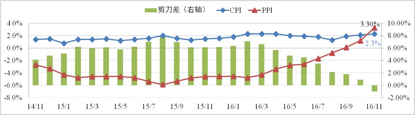 據國家統計局數據顯示,11月份CPI指數同比上漲2.3%,環(huán)比上升0.2個(gè)百分點(diǎn);PPI指數創(chuàng )5年來(lái)新高同比上漲3.3%,環(huán)比上升2.1個(gè)百分點(diǎn)。雖然CPI、PPI同步上漲,但PPI的漲幅明顯高于CPI,說(shuō)明物價(jià)上漲主要集中在上游原材料行業(yè),而中下游行業(yè)由于終端需求疲軟被迫承受來(lái)自上游成本壓力。