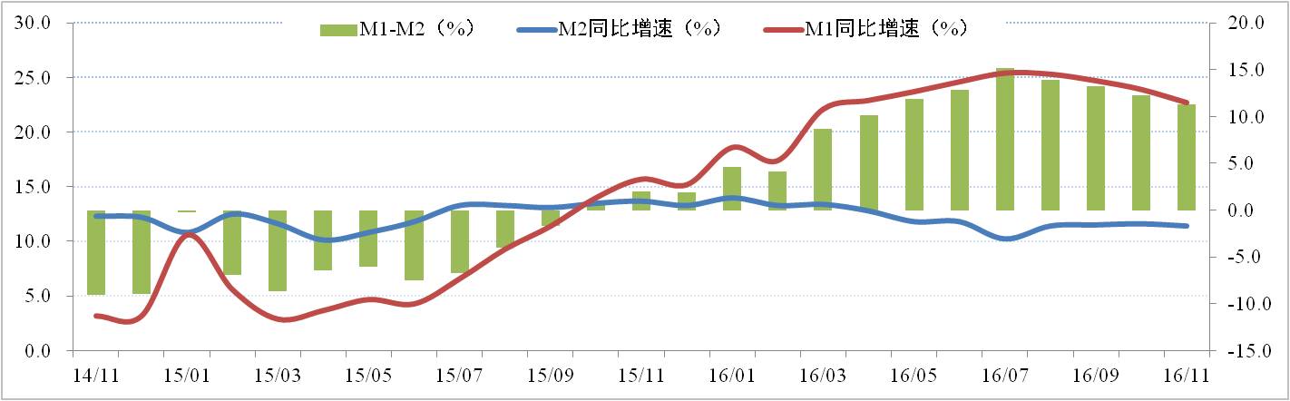 據央行數據統計顯示,中國11月M2貨幣供應同比增速為11.4%,環(huán)比回落0.2個(gè)百分點(diǎn);M1貨幣供應同比增速為22.7%,環(huán)比回落1.2個(gè)百分點(diǎn)。 M1與M2剪刀差進(jìn)一步縮小為11.3%。