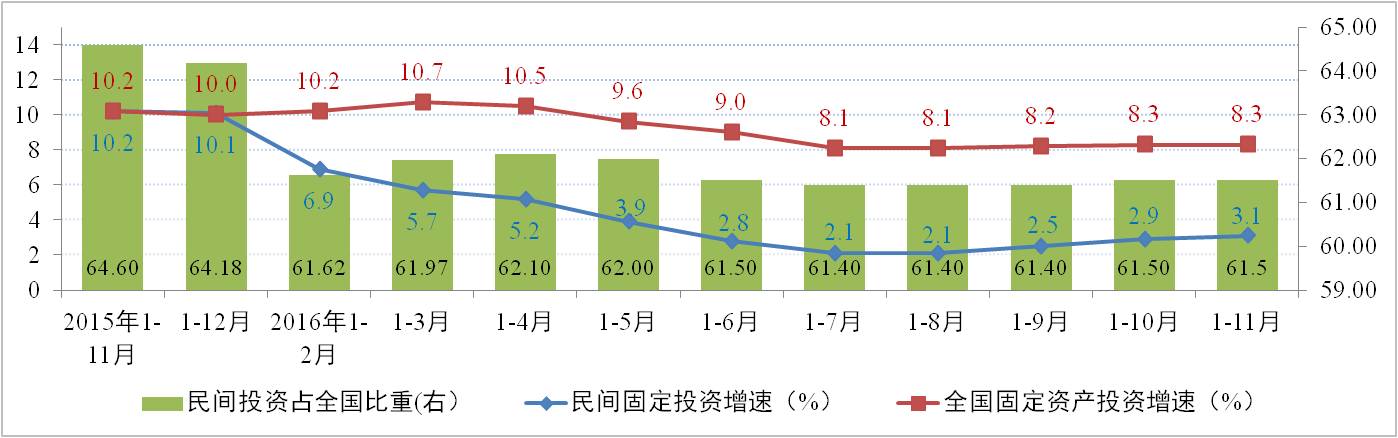 據國家統計局統計數據顯示,2016年1-11月,全國固定資產(chǎn)投資同比名義增長(cháng)8.3%,基本呈現橫向上升態(tài)勢但增速較小,對應了經(jīng)濟的L型特征。民間固定資產(chǎn)投資同比名義增長(cháng)3.1%,增速環(huán)比上升0.2個(gè)百分點(diǎn)。民間固定資產(chǎn)投資占全國固定資產(chǎn)投資(不含農戶(hù))的比重為61.5%,與上月持平。