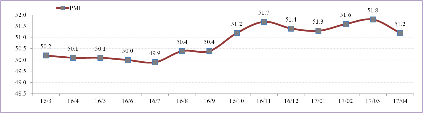 4月份中國制造業(yè)采購經(jīng)理指數(PMI)為51.2%,環(huán)比下降0.6個(gè)百分點(diǎn);其中,生產(chǎn)指數和新訂單指數為53.8%和52.3%,分別比上月回落0.4和1.0個(gè)百分點(diǎn),生產(chǎn)和新訂單仍位于擴張區間但兩者差值擴大至1.5個(gè)百分點(diǎn),供需矛盾進(jìn)一步擴大。