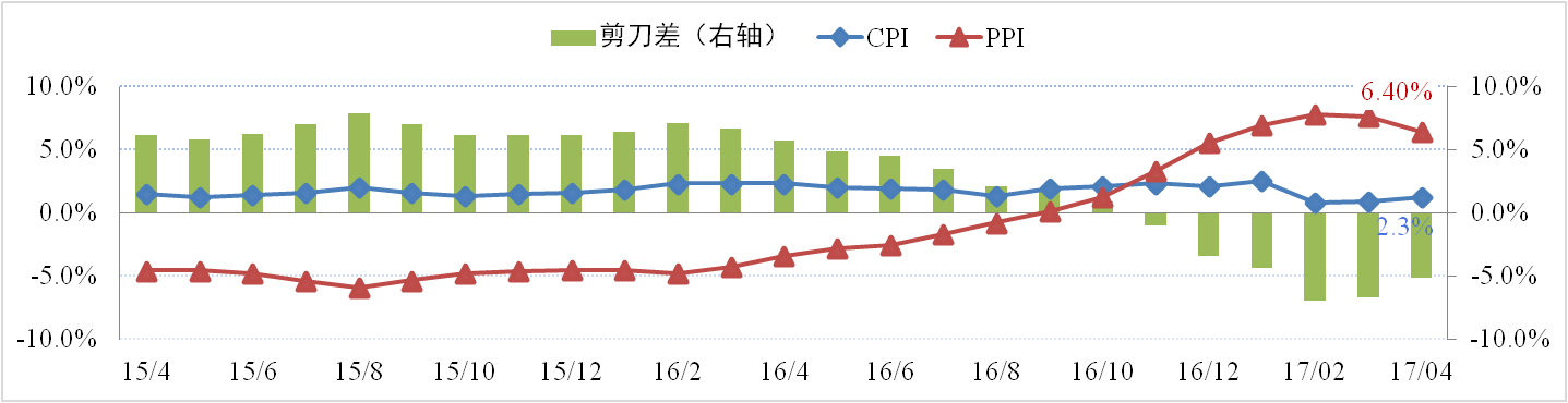 4月份CPI同比上漲1.2%,環(huán)比上漲0.1%;PPI同比上漲6.4%,環(huán)比回落0.4%。CPI連續兩個(gè)月回升,PPI連續兩個(gè)月回落,“剪刀差”進(jìn)一步收窄,物價(jià)形勢總體平穩。PPI漲幅回落主要受補庫存接近尾聲、需求收縮、大宗商品價(jià)格下跌以及去年低基數效應影響。