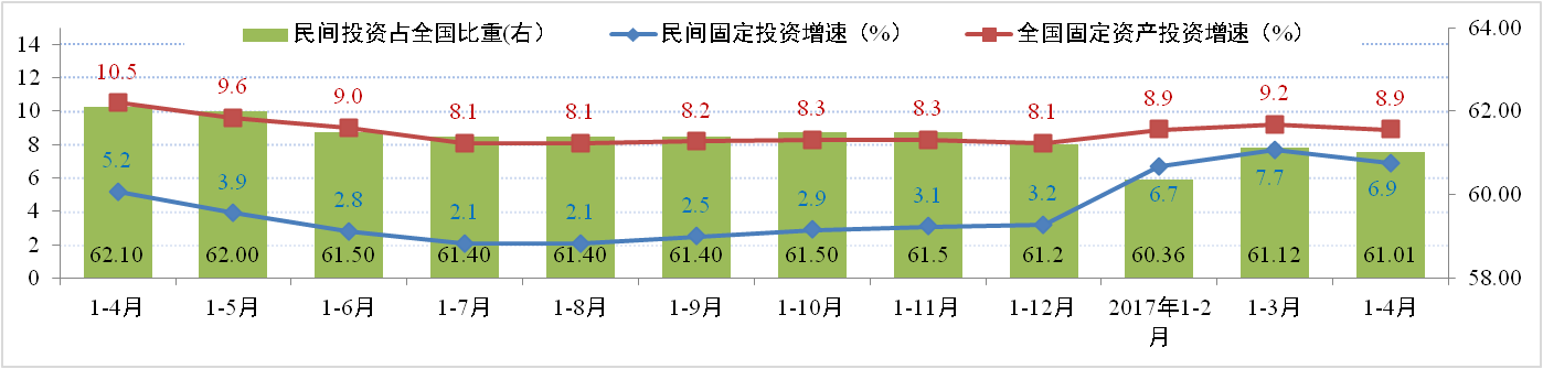 據國家統計局統計數據顯示,2017年1-4月全國固定資產(chǎn)投資(不含農戶(hù))14.43萬(wàn)億元,同比增長(cháng)8.9%,增速比一季度低0.3個(gè)百分點(diǎn)。其中全國民間固定資產(chǎn)投資8.8萬(wàn)億元,同比增長(cháng)6.9%,增速比1-3月份低0.8個(gè)百分點(diǎn)。民間固定資產(chǎn)投資占全國固定資產(chǎn)投資(不含農戶(hù))的比重為61%。