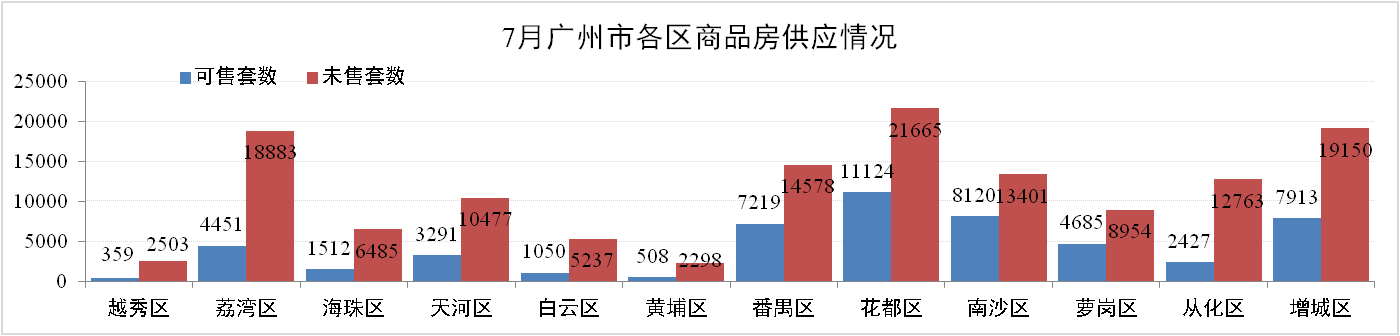 7月31日,廣州市新建住宅商品房共189,053套。其中:可售住宅商品房為52,695套,占比27.85%;未售住宅商品房136,394套,占比72.15%?;ǘ?、增城、番禺、荔灣庫存量較高,可售和未售房源累計占全市比例分別為58.31%和54.46% 。