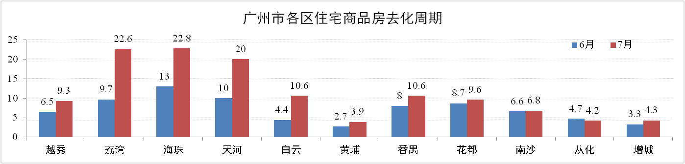 截至7月底,由于近期成交量回落,廣州住宅地產(chǎn)去化周期上升至7.2個(gè)月,總體庫存量為643.54萬(wàn)㎡。其中,海珠、荔灣、天河三區去化周期明顯上升,荔灣區為22.8個(gè)月,居于全市首位。而黃埔、增城等區因價(jià)格相對較低,剛需較強,去化周期僅剩4個(gè)月左右。