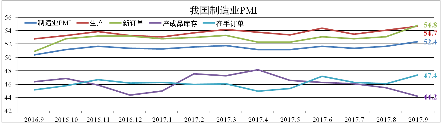 9月份我國官方制造業(yè)PMI為52.4,創(chuàng )下自2012年5月以來(lái)最高點(diǎn)。分項中, 在手訂單、新訂單分別擴大1.3、1.7個(gè)百分點(diǎn)至47.4以及54.8,產(chǎn)成品庫存縮小 1.3個(gè)百分點(diǎn)至44.2,生產(chǎn)上升0.6個(gè)百分點(diǎn)至54.7。