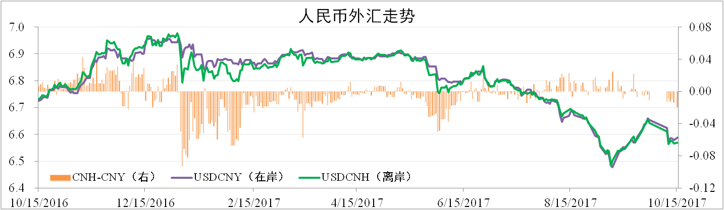 由于美聯(lián)儲縮表以及長(cháng)假居民購匯需求增加等原因,人民幣貶值。但美 朝局勢動(dòng)蕩,加之美國通脹疲軟,美元轉弱。截至10月15日,在岸人民幣匯 率為6.5884,環(huán)比貶值0.59%,離岸人民幣為6.5689,環(huán)比貶值0.37%。