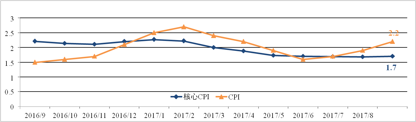 美國9月物價(jià)指數增速回升,但略低于市場(chǎng)預期。9月美國CPI為2.2%,較 上月擴大0.3個(gè)百分點(diǎn),核心CPI為1.7%,與上月基本持平。颶風(fēng)襲擊美國產(chǎn) 油區造成能源產(chǎn)能下降推高原油價(jià)格是CPI上漲的主要原因。