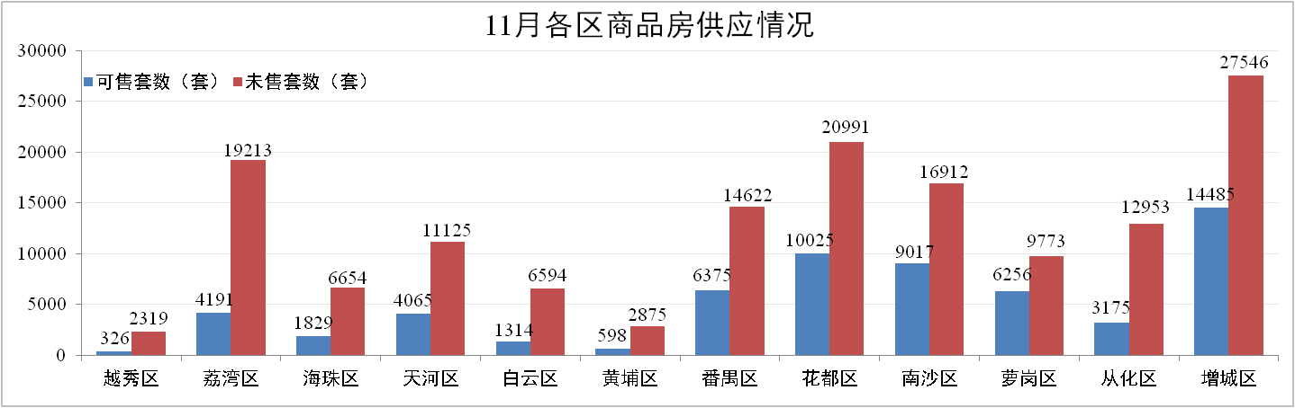 11月份廣州住宅地產(chǎn)去化周期為9.4個(gè)月,環(huán)比10月增加1.6個(gè)月,總體庫存量為763.68萬(wàn)m²,增城、花都等熱門(mén)區域由于新批預售集中在11月,拉動(dòng)整體庫存量增加。