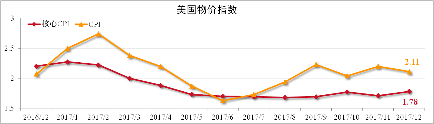 12月美國CPI為2.11%,較上月下滑0.09個(gè)百分點(diǎn)。剔除能源和食品的核心CPI為1.78,較上月擴大0.07,超出市場(chǎng)預期。2017年全年美國零售銷(xiāo)售增長(cháng)4.2%,為3年最大漲幅。