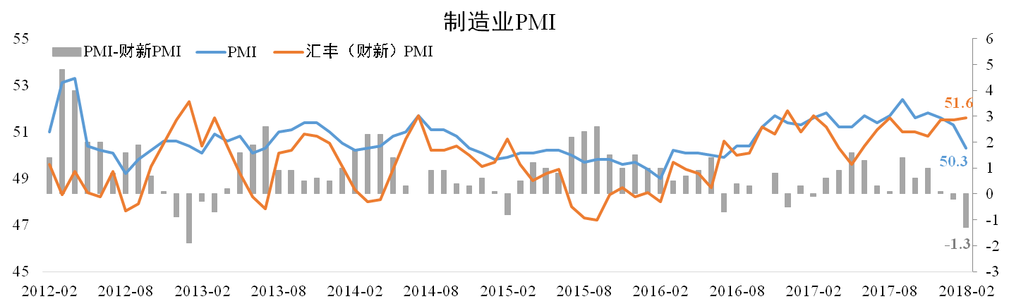 分析認為:官方制造業(yè)PMI雖仍處于景氣區間但回落幅度明顯大于季節性,反映了經(jīng)濟下行壓力,可能與金融收緊有關(guān)。3月份春節、限產(chǎn)等短期擾動(dòng)消退將導致PMI上行,但回暖幅度對2018年經(jīng)濟走向起到重要指示作用。