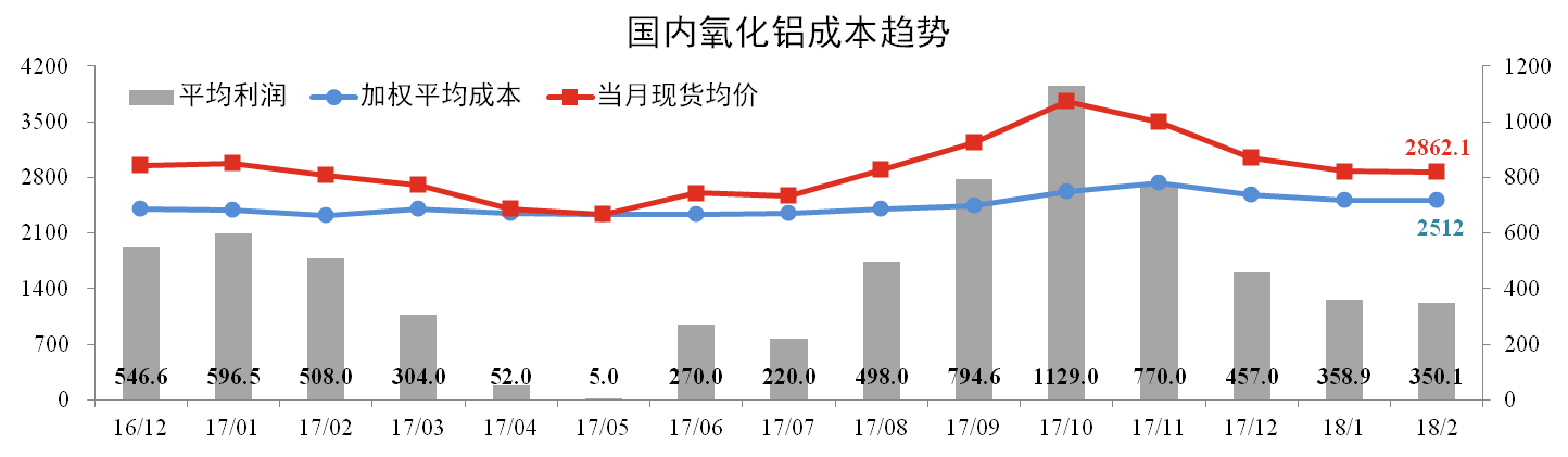 2月份國內氧化鋁加權平均成本為2,512元/噸,環(huán)比下跌0.12個(gè)百分點(diǎn)。當月全國氧化鋁現貨成交均價(jià)為2,862.1元/噸,較上月下跌0.41%。理論上,氧化鋁行業(yè)平均利潤水平為350.1元/噸。