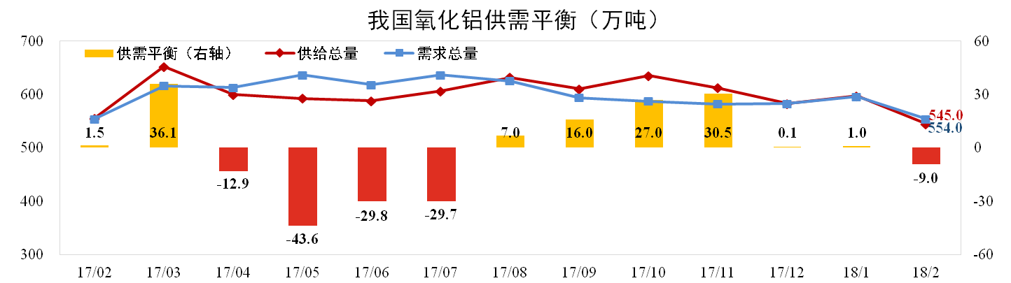 分析認為:受春節影響氧化鋁供需均有下降。二月氧化鋁進(jìn)口量萎縮而電解鋁日產(chǎn)量小幅提升,使得氧化鋁供需處于小幅短缺狀態(tài)。貴州華錦以及廣西華銀分別由于事故和礦石原因共減產(chǎn)約180萬(wàn)噸產(chǎn)能,預計3月供應依然短缺。