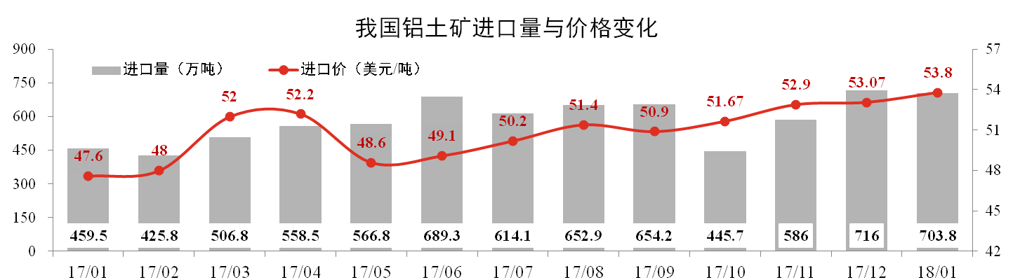 1月份我國鋁土礦進(jìn)口量為703.8萬(wàn)噸,同比增長(cháng)53.17%,環(huán)比下降1.75%。進(jìn)口均價(jià)53.8美元/噸,環(huán)比上漲1.4%。當月幾內亞鋁土礦進(jìn)口量再創(chuàng )歷史新高至350萬(wàn)噸,占當月總進(jìn)口量的49.73%。