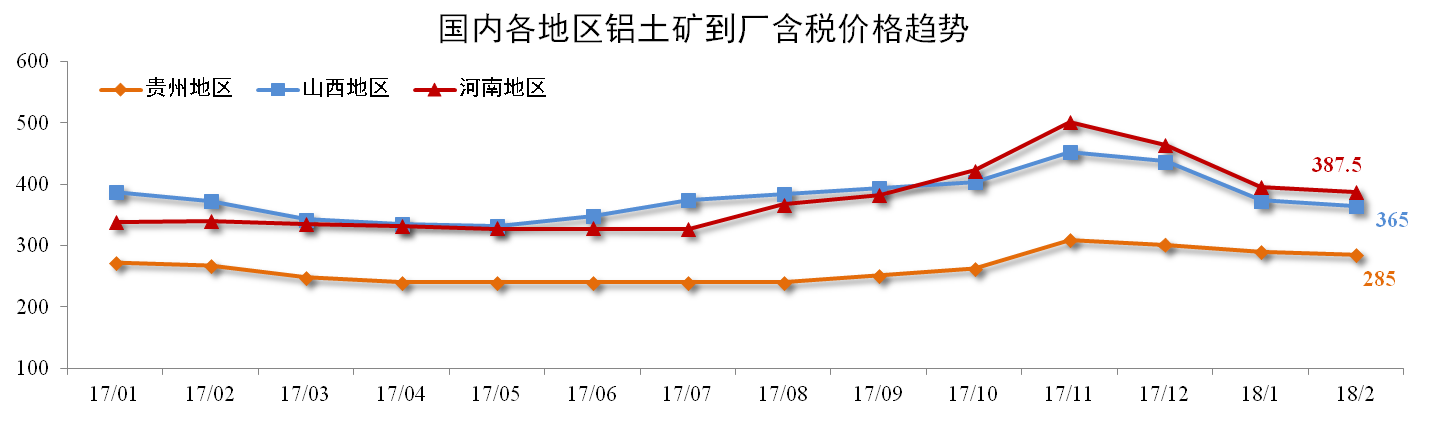 2月份各地鋁土礦價(jià)格保持下調。截止2018年2月,貴州(AL:60%,A/S:5.5-6)到廠(chǎng)含稅價(jià)月均價(jià)285元/噸,環(huán)比下降2.06%;山西鋁土礦365元/噸,環(huán)比下降2.38%;河南鋁土礦387.5元/噸,環(huán)比下降2.07%。