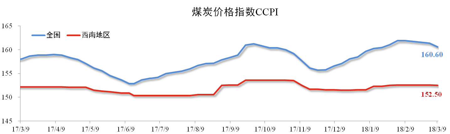 2月份我國煤炭?jì)r(jià)格呈現理性回落的趨勢。截至3月9日,全國煤炭?jì)r(jià)格指數報160.6點(diǎn),同比上升1.58%,環(huán)比下降0.8%。西南地區煤炭?jì)r(jià)格指數報152.5點(diǎn),同比上升0.2%,環(huán)比下跌0.07%。