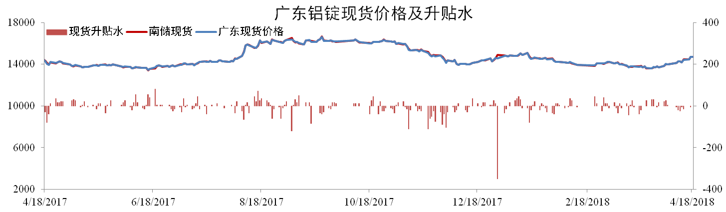 截至4月18日,南儲華南鋁錠現貨價(jià)報14,720元/噸,環(huán)比上升6.74%,廣東現貨成交價(jià)報14,720元/噸,環(huán)比上升7.05%。截至2018年4月12日,全國鋁錠庫存為211.74萬(wàn)噸,環(huán)比上升3.13%。南海庫存為42.11萬(wàn)噸,環(huán)比上升8.59%。