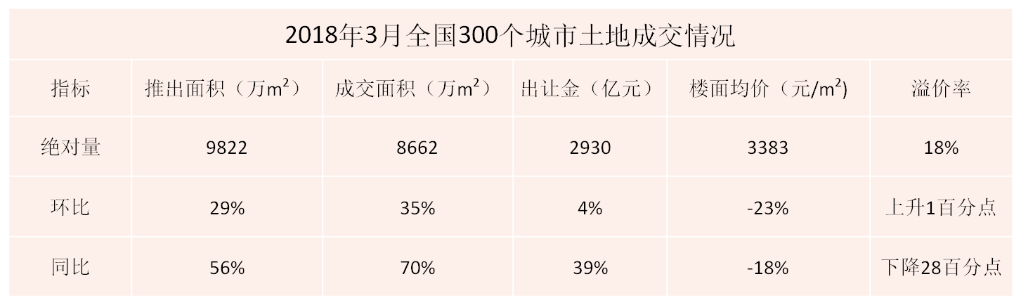 3月全國300城市土地市場(chǎng)總成交面積為8,662萬(wàn)m2,環(huán)比增加35%,同比增加70%。其中,住宅用地成交面積3,053萬(wàn)m2,環(huán)比增加29%,同比增加69%。土地溢價(jià)率為18%,環(huán)比上升1個(gè)百分點(diǎn),同比收縮28個(gè)百分點(diǎn)。