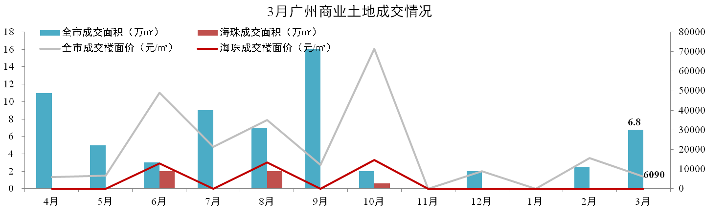 全市:3月共成交3宗商業(yè)地塊,成交面積6.8萬(wàn)㎡,成交樓面價(jià)6,090元/m2,琶洲區域暫無(wú)土地成交。