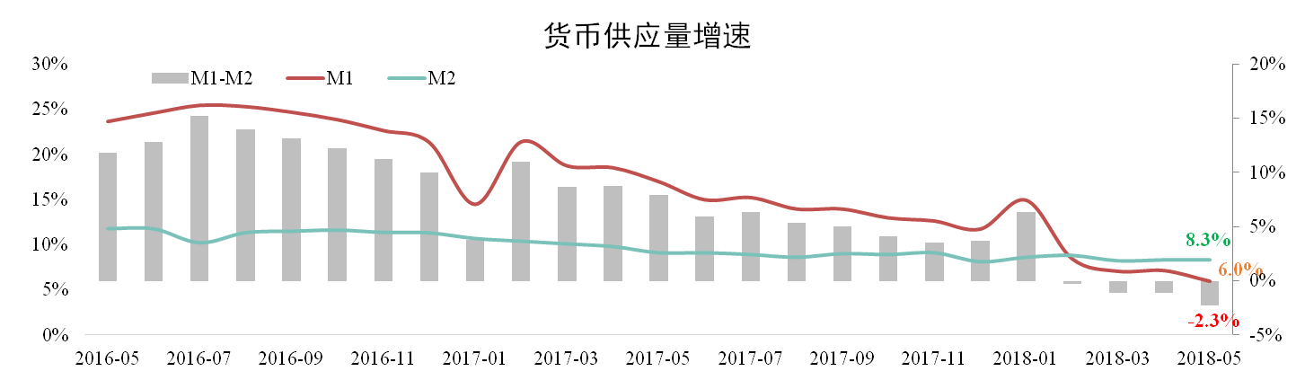 據人民銀行數據,5月份M1增速為6.0%,較上月下降2.3個(gè)百分點(diǎn),創(chuàng )兩年新低。M2增速為8.3%,與上月持平。剪刀差為-2.3%,連續4個(gè)月為負,說(shuō)明貨幣活力有所下降,實(shí)體經(jīng)濟流動(dòng)性偏緊。