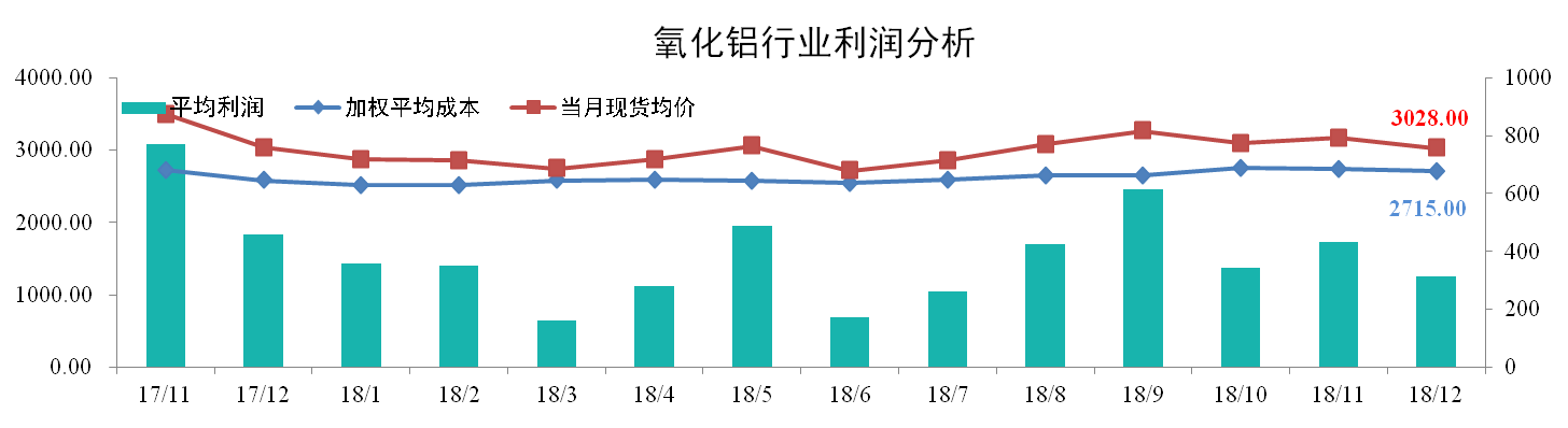 12月份國內氧化鋁加權平均成本為2715元/噸,較上月下降0.80%。當月全國氧化鋁現貨成交均價(jià)為3028元/噸,較上月下降4.51%。理論氧化鋁行業(yè)平均利潤水平為313元/噸。